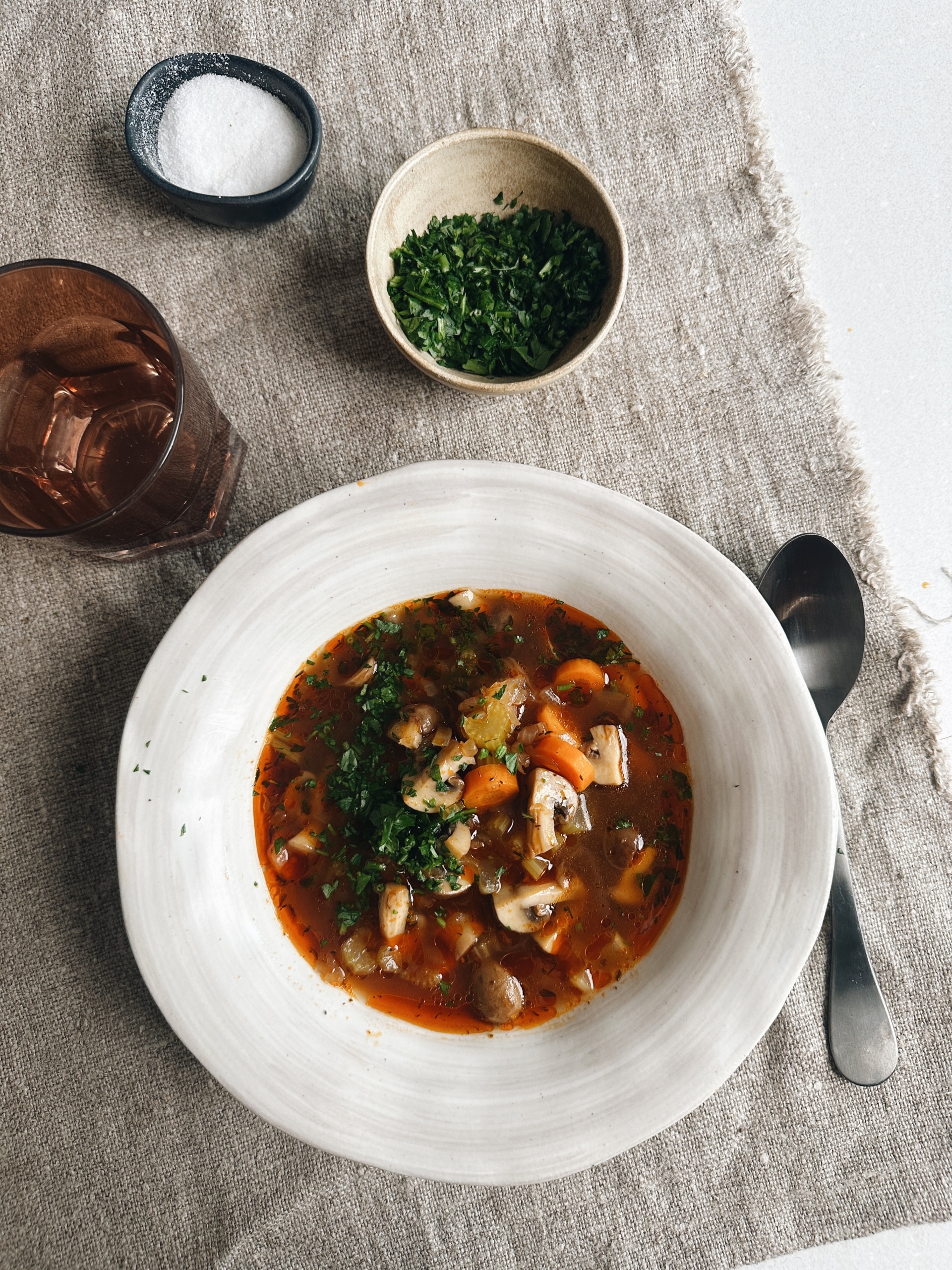 Ebben a leveseben a gomba íze a főszereplő – nem került bele se tejszín, se tejföl, minden egyéb hozzávaló kerekíti, kiegészíti a gomba meghatározó