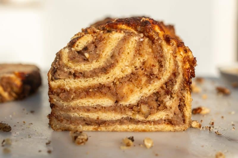 Imádjuk a babkát. Nem tudom eldönteni, hogy a rajongás oka az impozáns megjelenésének köszönhető-e vagy az ízének és az állagának, maradjunk abban, hogy minden faktor közrejátszik. Az eredeti csokoládés tölteléket a zsidó újév tiszteletére almás-mézes-diósra cseréltem, és egyáltalán nem bántuk meg. A fahéj szerintem teljesen elhagyható a receptből – én nem vagyok nagy fahéjrajongó, ezért csak a szirupba tettem egy leheletnyit, de fanok nyugodtan összefahéjazhatják az almát is. Az én receptemben a méz a királynő, javaslom a magas minőségű, erőteljesebb ízű méz választását.