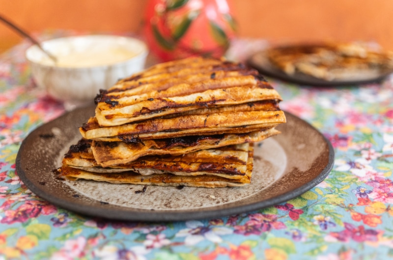 • A lepénykenyereket 4 részre felvágjuk. 1-1 lepényre nagyon vékonyan rányomkodunk a húsos töltelékből, majd lefedjük egy másik lepénnyel és összenyomjuk. A teljes adagot elkészítjük így, majd megkenjük a töltött lepények mindkét oldalát olívaolajjal, és rostlapon, grillen vagy kontakt grillsütőben ropogósra sütjük.