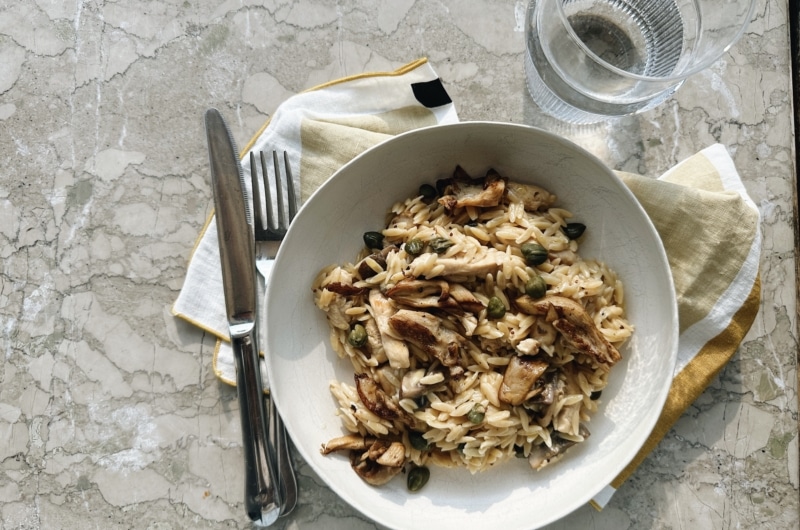 A gombás ételek nálam sokszor húsmentesek, de ez a citromos-gombás tészta most kivételt képez, ugyanis került bele némi csirke is, és szerencsére így a kamasz gyerekeim számára is elég laktatónak bizonyult. A gombához csodásan passzol a citrom, ahogy a fehérbor és a mustár is, így ezekkel is gazdagítottam a szószt. Bármilyen tésztával készülhet, de most az egyik kedvencemmel, orzóval, azaz rizsszemtésztával csináltam. Igazi laktató, villámgyors és isteni vacsora.