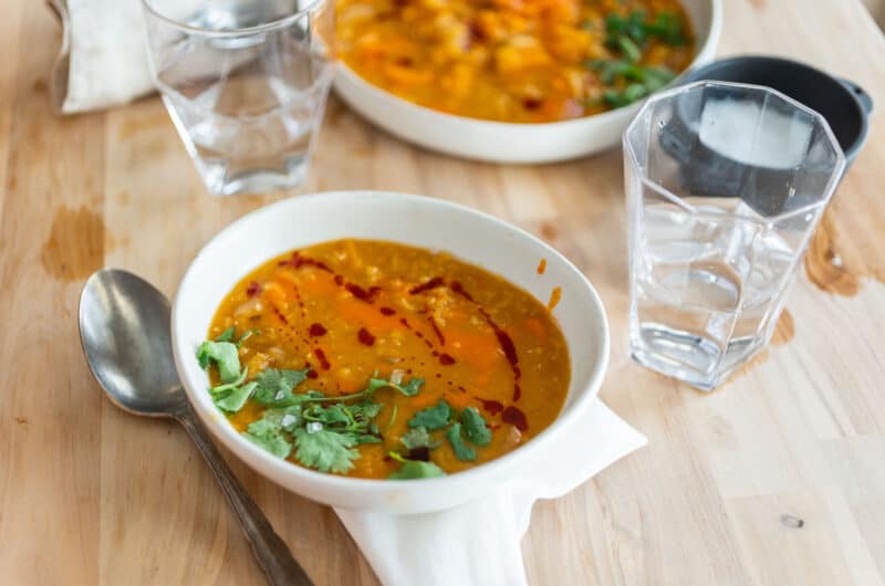 Ez egy gyors leves a hétköznapokra. Azt tudja, amit szeretnénk egy ilyen levestől: összedobáljuk a hozzávalókat, és gyakorlatilag megfőzi magát. Nem kell kevergetni, habarni vagy nagyon figyelni rá, mégis finom és laktató a végeredmény. Én szeretek a vöröslencse-levesbe citromot facsarni a végén, ez ellensúlyozza a krémes, édeskés ízeket. Aki nem szereti a koriandert, nyugodtan cserélje petrezselyemre vagy metélőhagymára.