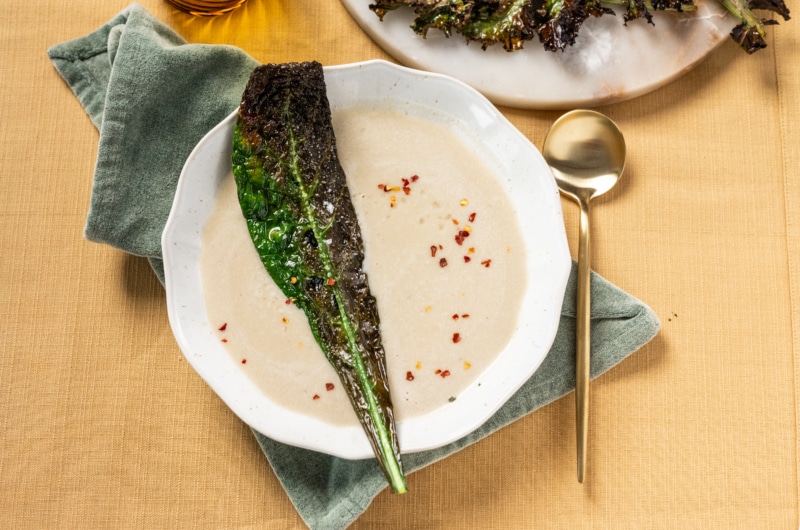 A krémleves nagyon klassz műfaj, hiszen gyakorlatilag bármilyen zöldségből összedobható tápláló, melengető (vagy épp hűsítő) fogás. Persze megvannak a legnépszerűbb kombinációk, a sütőtökből, cukkiniből, brokkoliból készült verziók mindenkinél visszatérő elemek szerintem, ami teljesen rendben is van, mégis érdemes néha valami újat is kipróbálni. Babfélékből kifejezetten ritkán készül krémleves, pedig nagyon gyorsan készen van, és üde színfolt lesz az őszi-téli menüben. Pláne fodros kelből készült chipsszel, amitől extrán egészséges lesz a végeredmény.