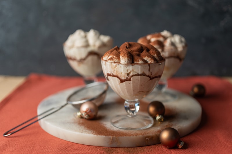 Ez a gesztenyés pohárkrém igazi utolsó pillanatos desszertnek is abszolút megfelel – mindössze pár alapanyag és néhány perc kell az elkészítéséhez. Kicsit hajaz a tiramisura, de kávé helyett kakaóba áztatott babapiskóta kerül bele, tojás nélkül, viszont sok-sok puha tejszínhabbal készül. Ha megunod – bár tudom, ezt nehéz elképzelni – a bejglit és a zserbót, ez az édesség üdítően könnyű falat lesz az ünnepi lakoma végén.
