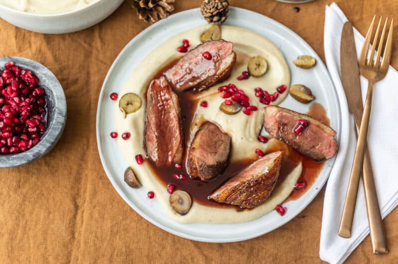 Az ünnepi sültek közül a rozé kacsamell a legkevésbé időigényes, ezért jó szívvel ajánlom mindenkinek, aki nem szeretne napokig készülni a karácsonyi menüre. Az egyetlen fontos szabály az, hogy nem szabad túl magas hőfokon sütni, hogy megfelelő hőkezelést kapjon a rozé állag eléréséhez. Ebben a receptben különleges hozzávaló a gránátalmaszirup, ami nagy kedvencem. Közel-keleti fűszerboltokban és delikátesz üzletekben lehet beszerezni. A köret megér egy külön misét, igazán különleges, ünnepi ízkombináció a mandula-gesztenye-zeller párosítás.