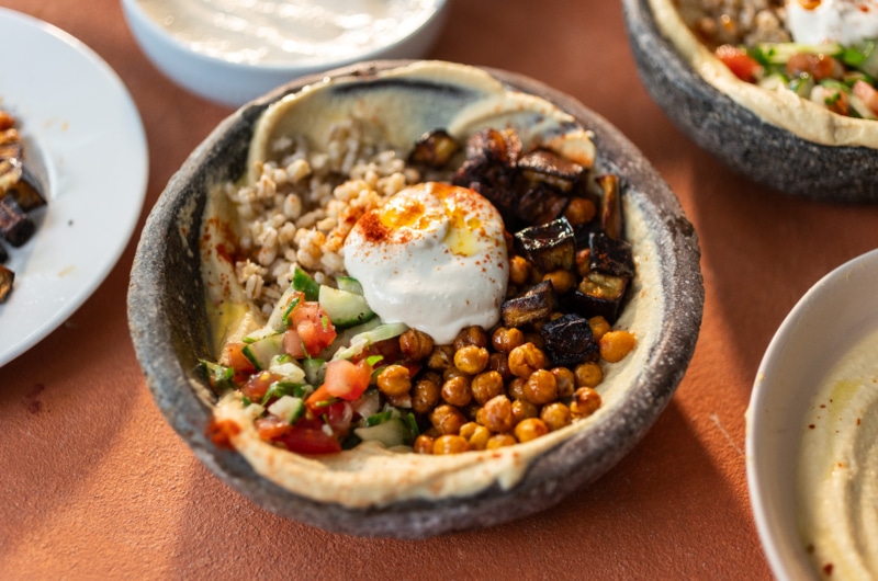 - A hummuszt egy tálba szedjük és szétkenjük, majd adagonként halmozunk rá a főtt gersliből, a sült padlizsánból, a ropogós csicseriborsóból és a salátából. Meglocsoljuk tahinis öntettel és kevés olívaolajjal, megszórjuk Cayenne-chilivel, római köménnyel, végül kanalazunk rá egy kis joghurtot.