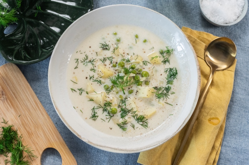 - Átszűrjük a levet a turmixgépbe, hozzáadjuk a tejszínt és annyi burgonyával simára turmixoljuk, hogy közepesen sűrű levest kapjunk. Visszatesszük a maradék burgonyát, zöldborsót, összemelegítjük a levest és friss kaporral tálaljuk.