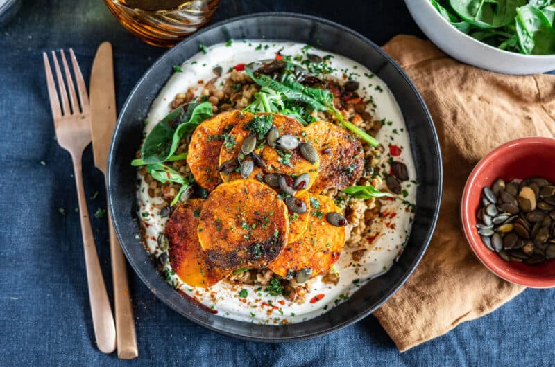 - A görög joghurtot szétkenjük a tányérokon. Erre halmozzuk a langyos lencsés bulgurt, rá a spenótot, meglocsoljuk egy kis balzsamecettel és olívaolajjal. Ráhelyezzük a sült tökszeleteket és megszórjuk pelyhesített sóval, pirított tökmaggal.