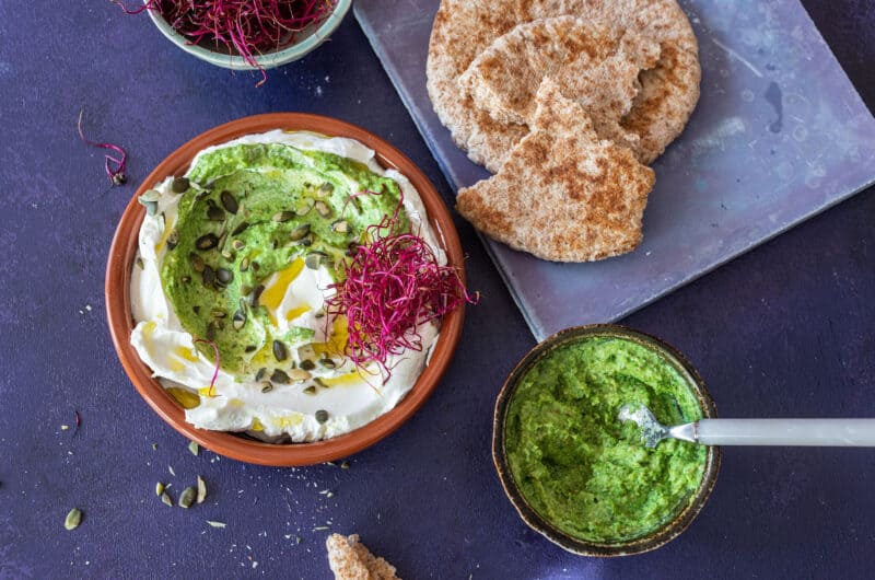 - Tálaláskor a pitákat kissé megpirítjuk, a joghurtsajtot medvehagymapesztóval ízesítjük és céklacsírával, pirított tökmaggal díszítjük.