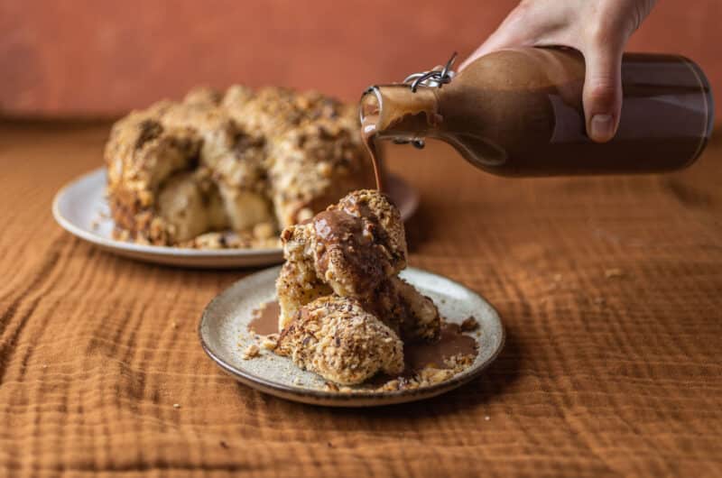 • A megkelt tésztát ujjnyi vastagra nyújtjuk, majd az olvasztott vajba mártott kanállal kiszaggatjuk. A galuskákat megforgatjuk olvasztott vajban, aztán a nádcukorral elkevert mogyoróban, majd egy vajjal kikent, 20 cm-es tortaformába fektetjük őket. Fél órán át megint kelni hagyjuk, végül 180 fokon 35–40 perc alatt aranybarnára sütjük.