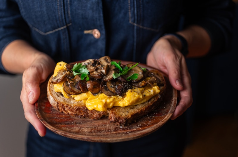 Sokszor elég csak néhány szuper alapanyag, hogy egészen rövid idő alatt valami nagyon finomat készítsünk: megpirítottam egy adag gombát vajon, tekertem rá egy nagyobb adag borsot, és a pirítás végén leöntöttem egy kis szójaszósszal. Ez felturbózza az umamit, ami a gombától egyébként sem idegen. Ugyanebben a serpenyőben elkészítettem a rántottát, rezgősre, már csak egy szelet kovászos kenyér hiányzott és kész is a reggeli!