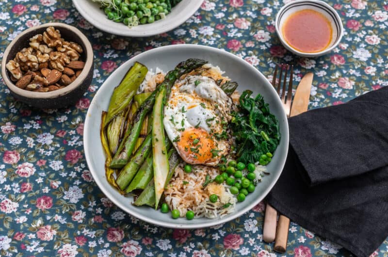 - Egy tálba szedjük a rizst, megpakoljuk az előkészített zöldségekkel, rátesszük a tojást és meglocsoljuk az öntettel.