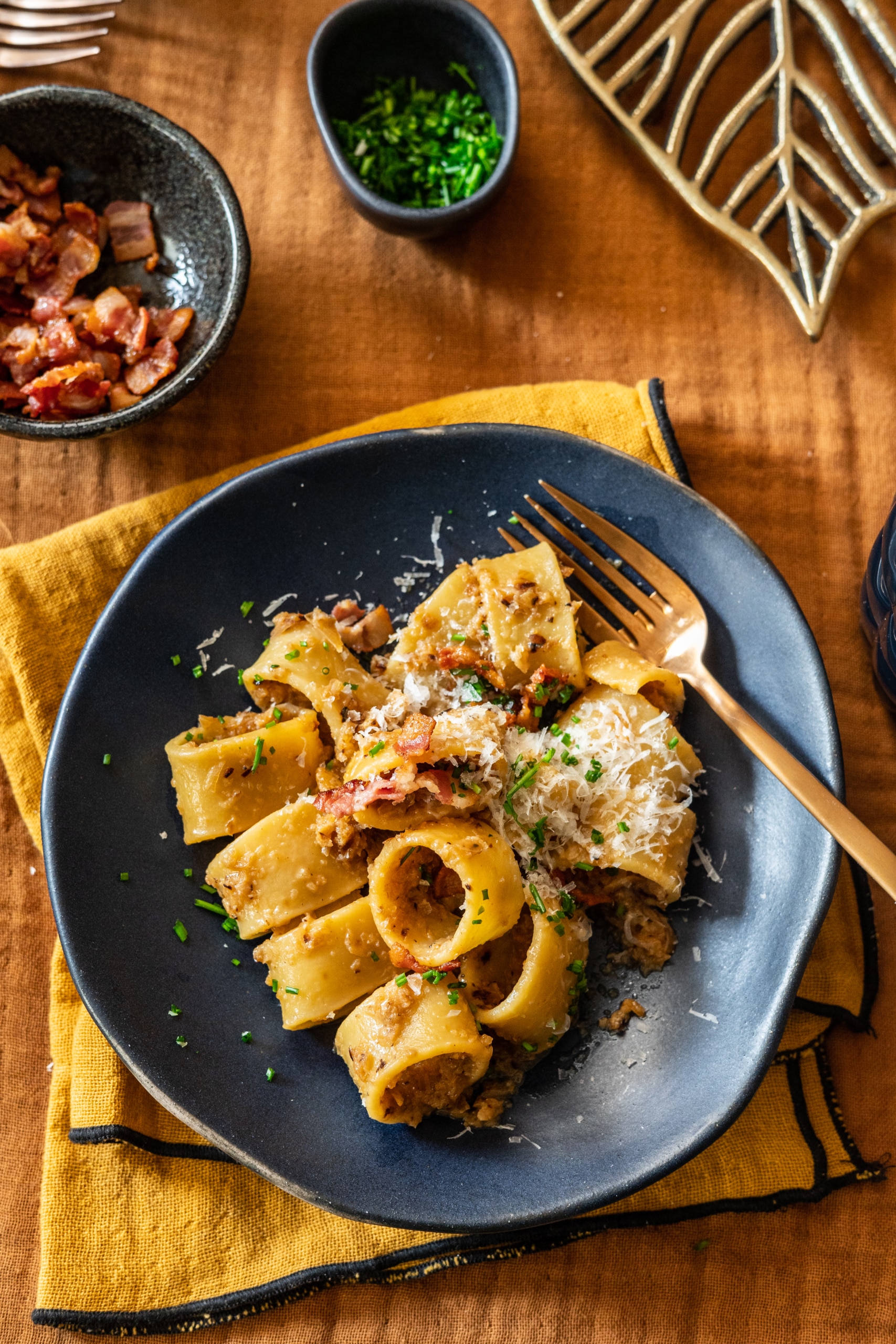 • Egy serpenyőben egy evőkanál olajat felhevítünk, és rádobjuk a felaprított bacont és hagymát. Ezeket pirosra pirítjuk, majd felöntjük fehérborral, és ezt el is főzzük róla. Őrölt borssal fűszerezzük, adunk hozzá egy kevés magos mustárt és balzsamecetet is. Végül hozzáadjuk a tejszínt, és belereszeljük a sajtot, majd addig kevergetjük, amíg a sajt elolvad. A bab csak akkor kerül bele, ha már egy krémes, sűrű, fűszeres alapunk van. Csak a végén sózzuk, ha igényli az étel.