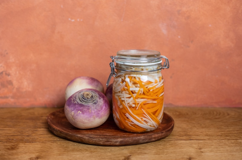 - A sárgarépát és a tarlórépát egyforma, vékony csíkokra vágjuk és egy nagyobb befőttesüvegbe szorosan lerétegezzük.