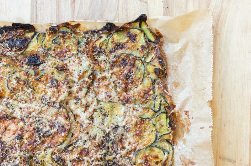 Ennek a cukkinilepénynek rengeteg receptváltozatát megtaláltam, amikor a Toszkánában kóstolt, leheletvékony, ropogós snack után kutattam. Szerintem ebben a formában a legizgalmasabb, de létezik sokkal magasabb, vagy akár tésztaalappal készülő változat is. Ebben azt szeretem, hogy a vékony cukkiniszeletek ropogósra sülnek, a fűszerekkel és a reszelt parmezánnal gyakorlatilag összeolvad a zöldség.