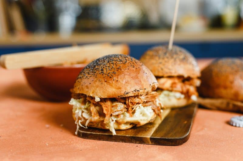 - Összeállítjuk a szendvicset: minden kettévágott buciba egy adag káposztasalátát és egy jó nagy adag tépett, szaftos csirkét teszünk.
