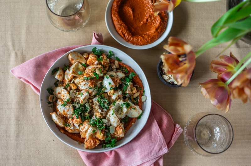 Ez lesz az idei húsvéti tojássalátánk, és őszintén ajánlom, hogy próbáljátok ki ti is. Mindig vannak időszakaim, amikor egy-egy alapanyagra vagy ízre rákattanok, most éppen a romesco szósz a soros, január óta tart az erős vonzalom és a kísérletezés. Olvastam a NYT-on egy receptet, és azt fejlesztettem tovább sós citrommal, kapribogyóval és savanyított hagymával – szerintem nagyon izgalmas lett!