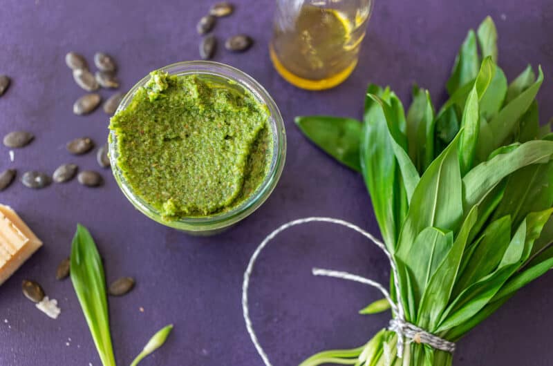 Szeretem együtt a tökmag és a medvehagyma ízét – az egyik még a telet búcsúztatja, a másik pedig a tavasz első igazi friss íze. A medvehagymával nehéz felvenni az versenyt, és nem is szeretném, hogy bármi elnyomja azt, így a tökmag mellé szoktam mandulát is tenni. Ezeken kívül pedig csak a szokásos alapanyagok kerülnek a pesztóba: extra szűz olívaolaj, kevés parmezán és só.