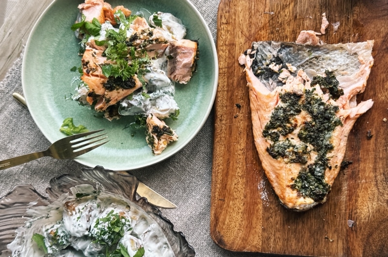 Szeretem a kora őszt, amikor a saláták elkezdenek tartalmasabbak lenni, de még szívesen fogyasztunk hideg köreteket, és lehet frissen szüretelni a zöldfűszereket. Ki kell még élvezni ezeket a napokat, amikor sok minden gazdagon terem – és persze lehet ezekből elraktározni a hűvösebb időkre is, a zöldfűszerek esetében például ez egyáltalán nem nehéz feladat. Készíthetsz például fűszervajat, ahogy én is tettem ennél a zöldfűszeres lazacnál – könnyen fagyasztható és sok mindenre lehet később is használni.