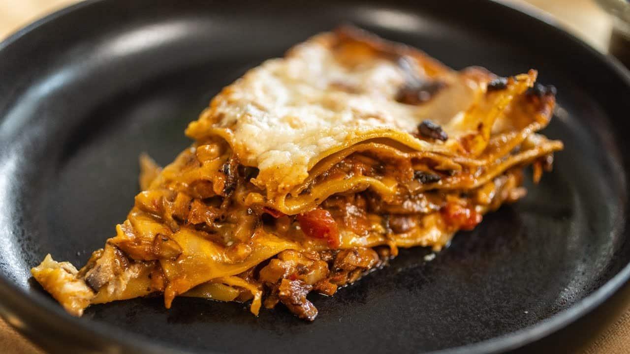 Vega lasagne sűrű, krémes töltelékkel és sokféle gombával.